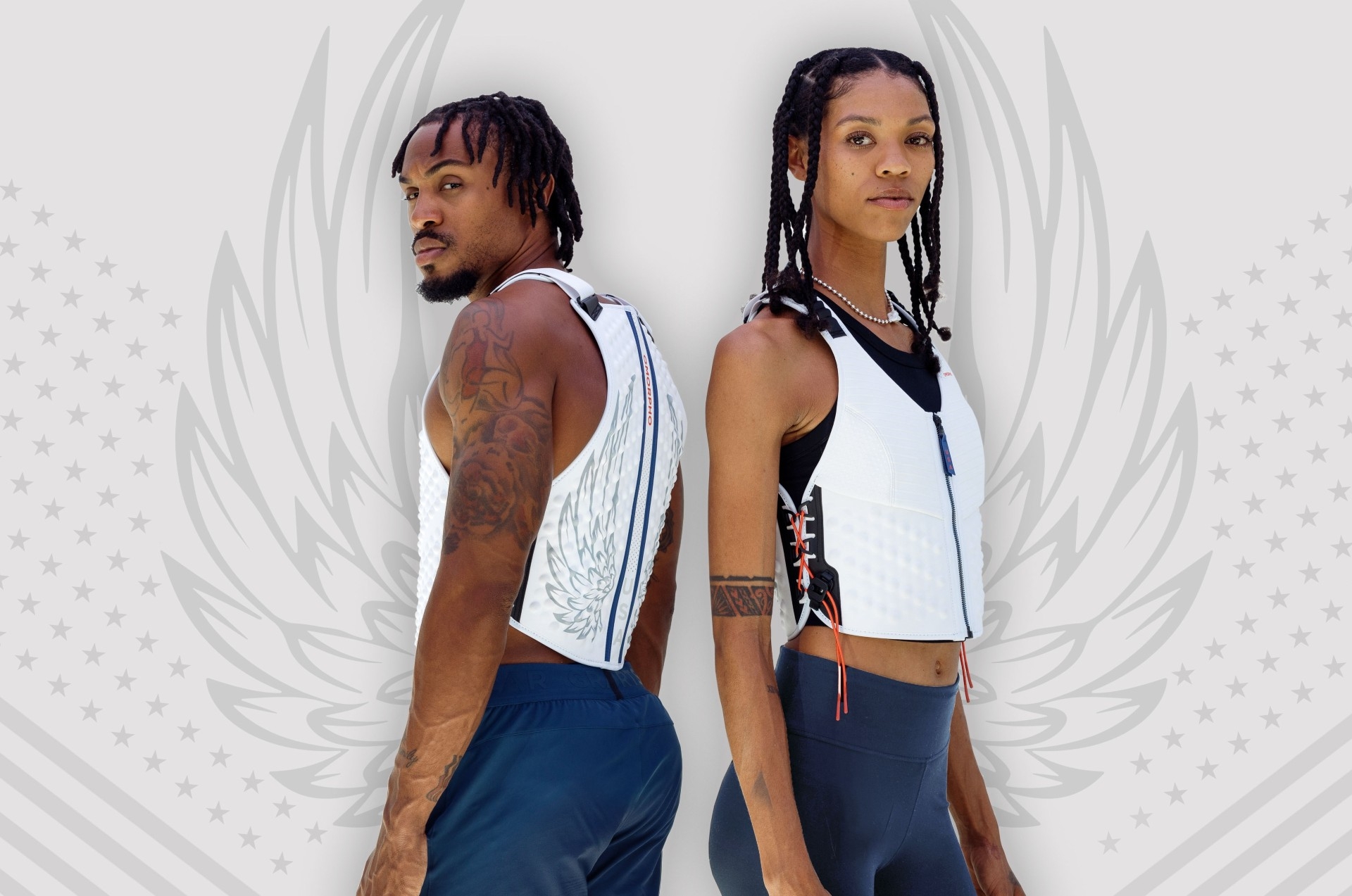 The OMORPHO G-Vest Sport USA. was designed by Natalie Candrian, recipient of Fast Company’s Most Creative People in Business for her work with the brand, and in partnership with Team USA high jumper Vashti Cunningham. Vashti has been training with the G-Vest Sport in hopes of bringing home her first Olympic medal.