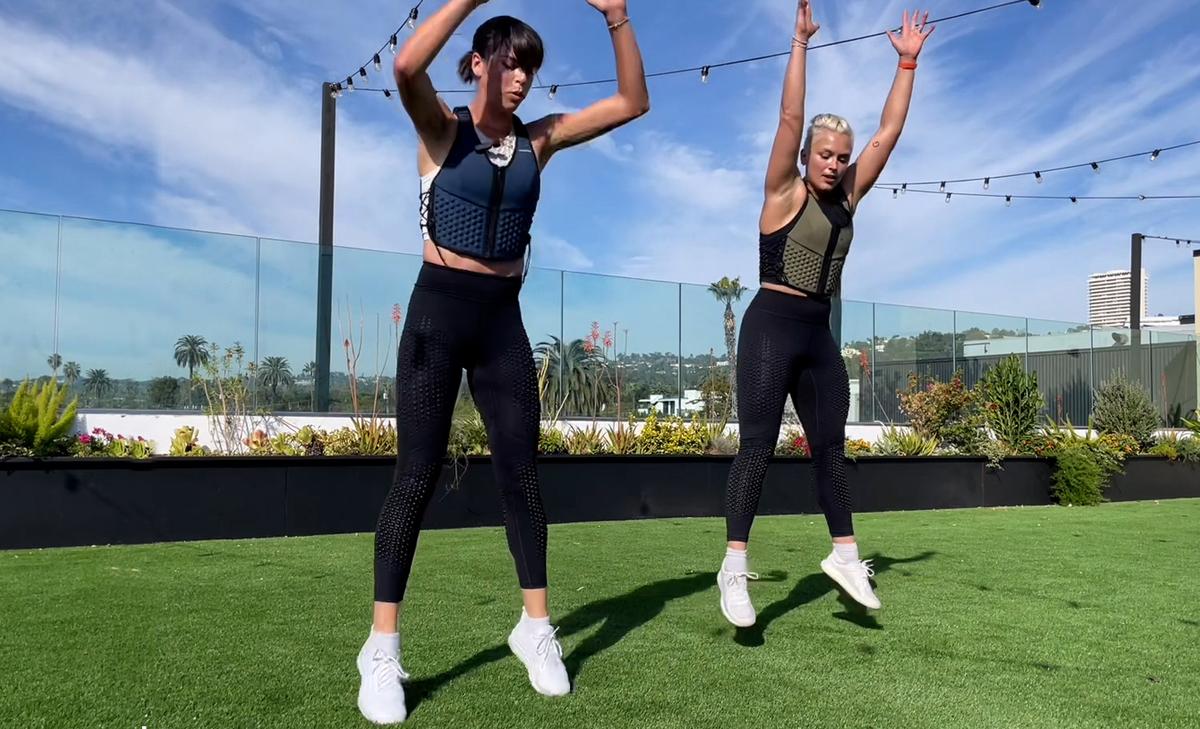 For block 2, we remove the vest and use it as an external weight - moving the weight away from your body changes the nature of the exercise by taxing your core more and forcing you to focus on your form. The airplane exercise is a play off of a single leg deadlift, but with arms (and vest) extending overhead - the goal here is balance and standing leg strength. The second exercise is a pop lunge; when you sink into the jump lunge, the vest goes overhead. Again, this is testing your overhead strength and core stability, in addition to a real leg burn. This is where you'll really feel the added challenge of distributed weights across your legs with our G-Tight. Another option for the pop lunge is to take out the jump, but try to drive your back knee down and feel that glute activation!